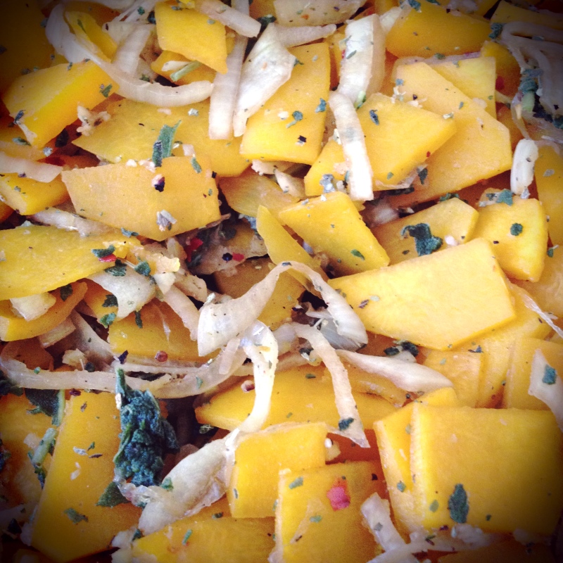 Peel (if necessary), core and cube your squash and toss in the marinade. Pour it all, including the leftover marinade, into an oven dish. Cook on 180 for about 45 minutes, until soft, stirring occasionally.